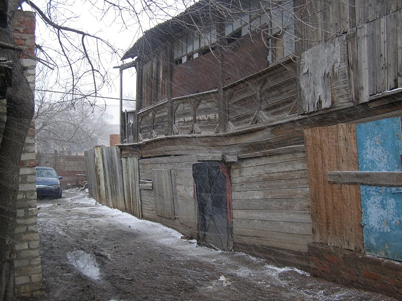 A view typical of Astrakhan – a poor hut on the background of a huge hypermarket.